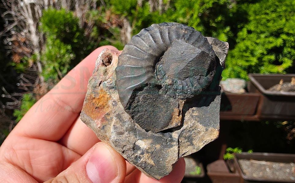 Další minerály: Sedimentární matrix kolem amonita může obsahovat vápník, drobný křemen nebo jílovité minerály, ale samotná schránka je převážně uhlíkatá.