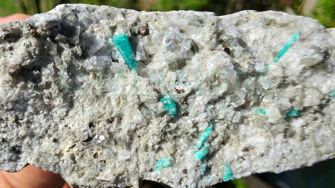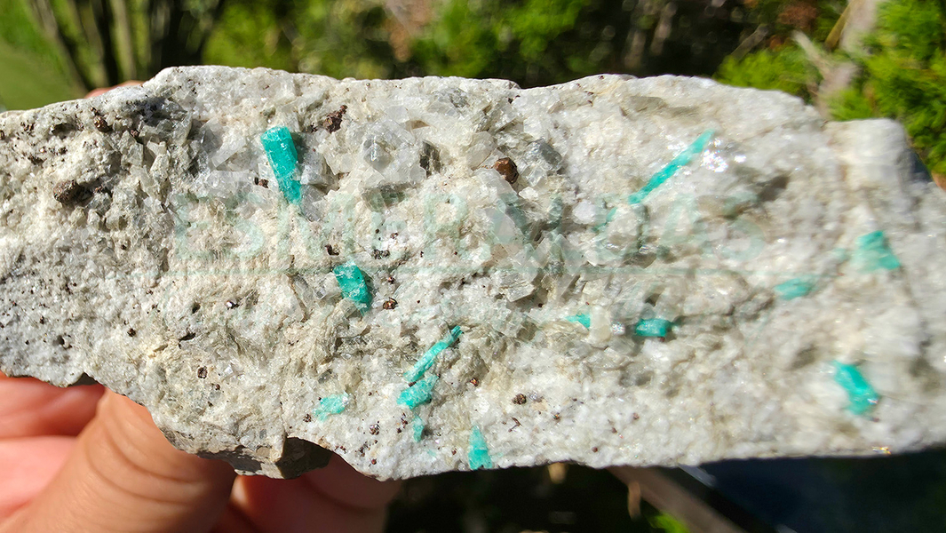 • Smaragd, kalcit a pyrit na hornině
