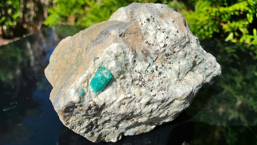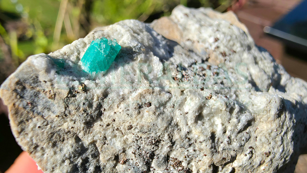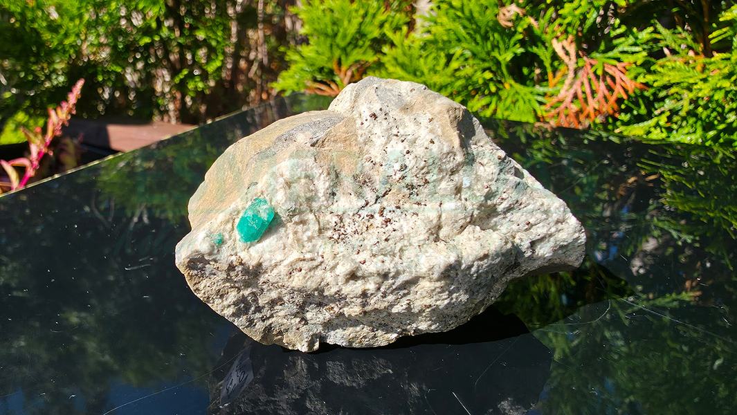 • Smaragd, kalcit a pyrit na hornině